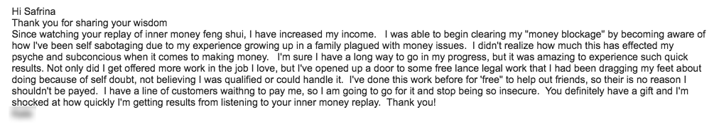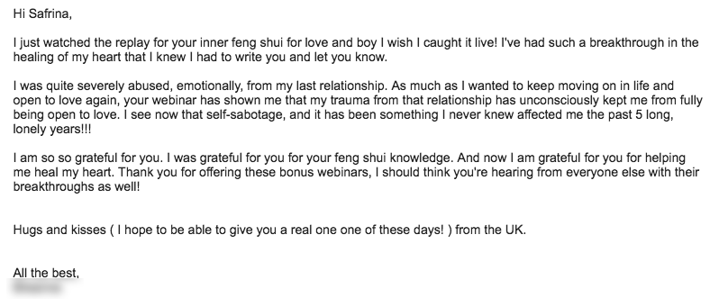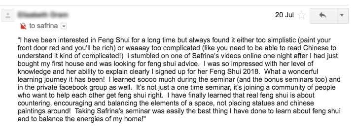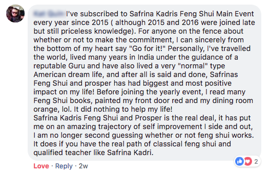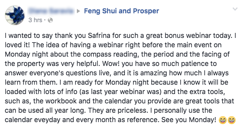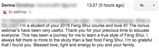 As a client that’s had some incredible results with Safrina’s help, I’m surprised that a practitioner with her talents and understanding of the real art of feng shui even offers something like this annual webinar! Safrina is very generous with her time and knowledge; so you always get so much more than you’re expecting in all of her courses and webinars. All I can say is don’t miss this one, I can absolutely guarantee you will be amazed at what’s in it; and what you learn from it!