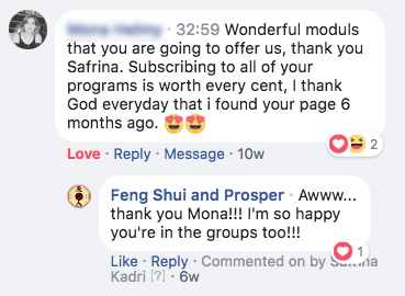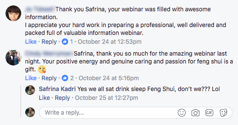 Worried you might have questions after watching the content? I got you! My private Facebook group ( ONLY for those who register for Feng Shui 2019 ) has amazing discussions and members are finding a lot of additional learning and support from it. Here’s just a snapshot of how much members love it!